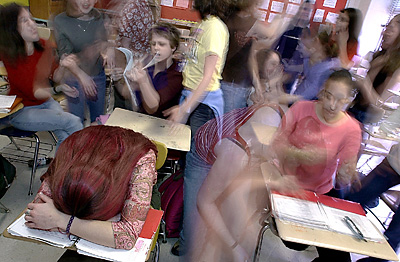 Lizzie Wood, junior at Bethesda-Chevy Chase HS, sleeps in a classroom full of activity