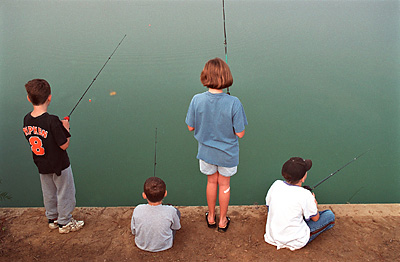 Kids line the shore fishing in a Fish-A-Thon to raise money for cancer research